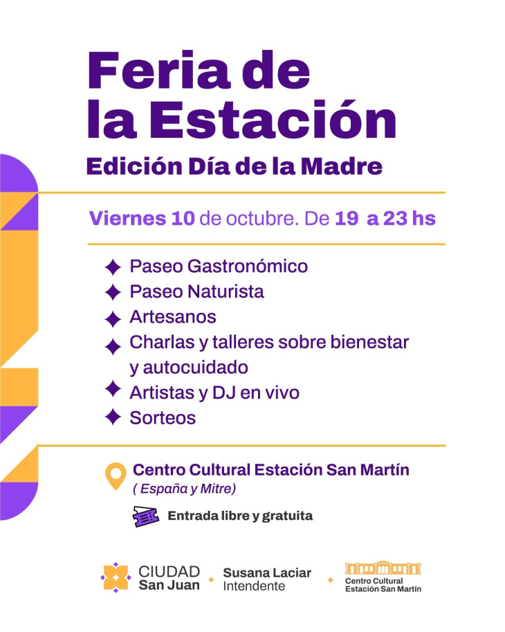 La Municipalidad de la Ciudad de San Juan invita a participar de una nueva edición de la Feria de la Estación, dedicada especialmente a homenajear a las madres en su día. El evento tendrá lugar este viernes 10 de octubre, de 19:00 a 23:00, en el Centro Cultural Estación San Martín (España y Mitre), con entrada libre y gratuita.