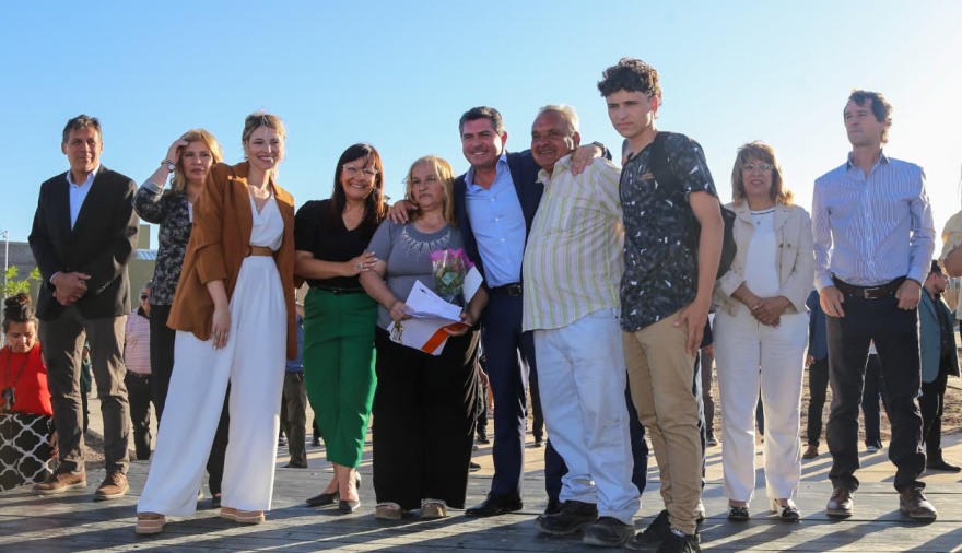 El gobernador estuvo acompañado por la directora del IPV, Elina Peralta; el ministro de Infraestructura, Agua y Energía, Fernando Perea; y la intendenta de Chimbas, Daniela Rodríguez, junto a otras autoridades que se sumaron para compartir la alegría de los flamantes vecinos.