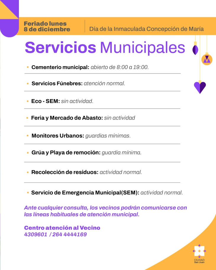 La Municipalidad de la Ciudad de San Juan informa cómo funcionarán los servicios municipales durante el feriado del lunes 8 de diciembre, asegurando la continuidad de las prestaciones esenciales.