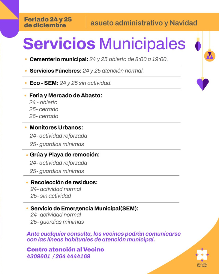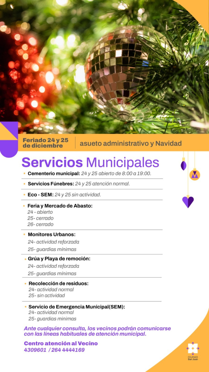 La Municipalidad de la Ciudad de San Juan informa el esquema especial de funcionamiento de los servicios municipales con motivo de las celebraciones de Navidad.