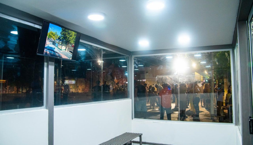 Se trata de una parada completamente cerrada, diseñada como una “pecera” moderna, con cerramiento total en blindex, puerta corrediza, iluminación interior y exterior, banco para espera, pantalla informativa, y sistema de aire acondicionado frío-calor, permitiendo resguardar a los vecinos tanto de las altas temperaturas del verano como del frío durante el invierno.