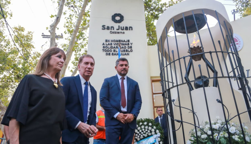 El encuentro tuvo lugar en el monumento de la Eterna Llama Votiva, ubicado en la intersección de Avenida Libertador y Paula Albarracín de Sarmiento, que se construyó para recordar la resiliencia del pueblo tras el histórico sismo, convirtiéndose en un símbolo de superación. Allí Orrego y Santilli encendieron la significativa llama, en un momento de profunda contemplación.